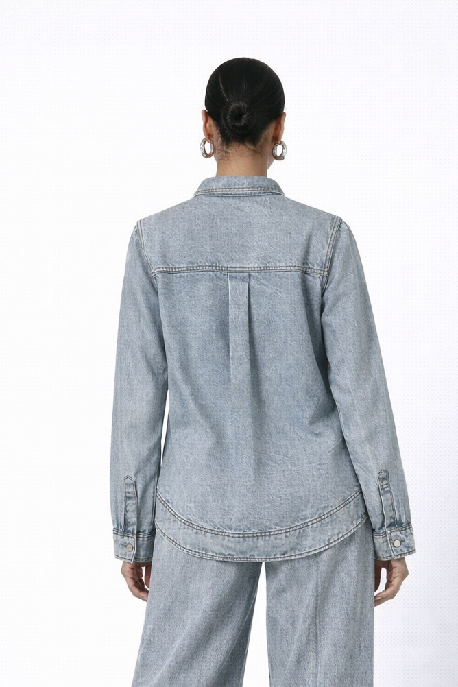 يبدو القميص أطول قليلاً من الجانبين بسبب انحناءة طبيعية. ياقة على الطراز الصيني. تنظيف نظيف، تشطيب بسيط.