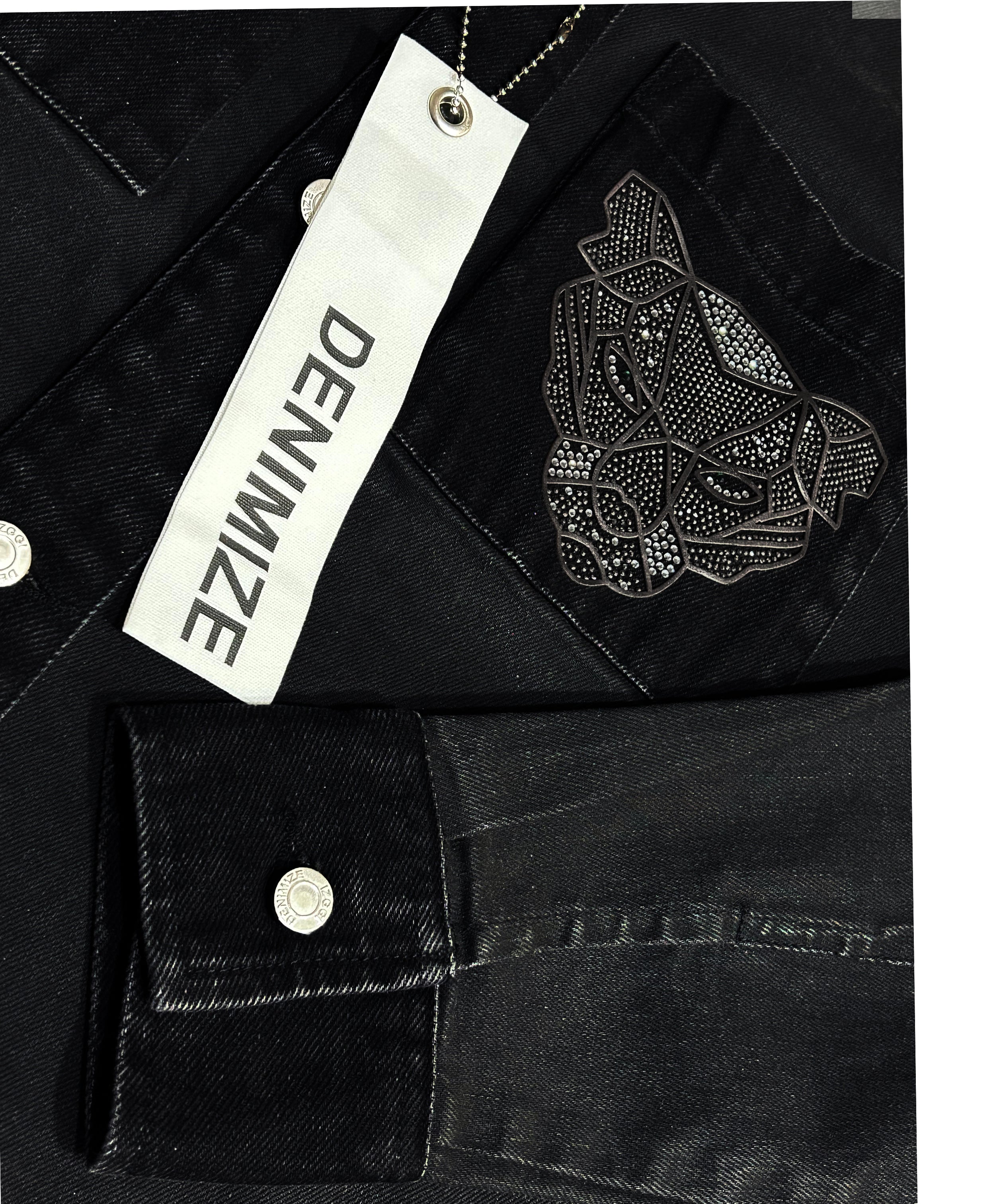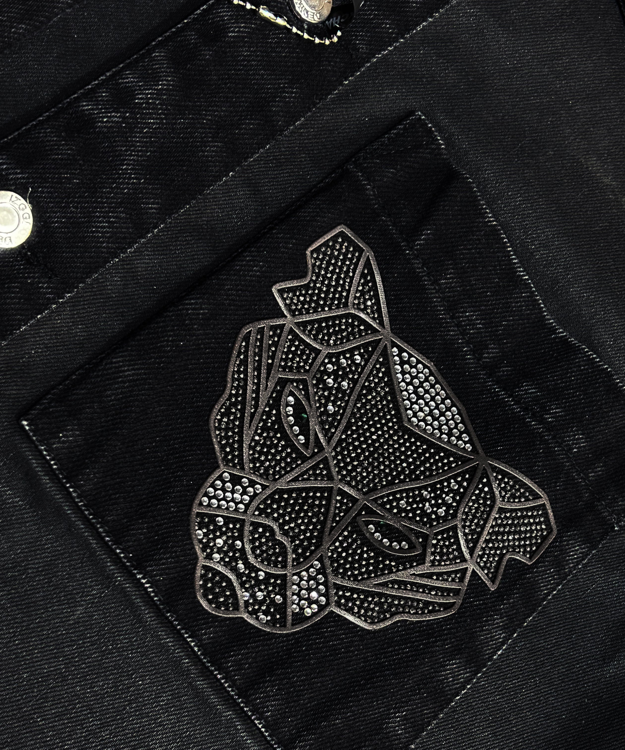 قميص جينز أسود باهت اللون يتميز بجيبين أماميين ورقعة جريئة عليها رسمة نمر، مما يوفر مظهرًا قويًا لملابس الشارع مع لمسة نهائية فاخرة.