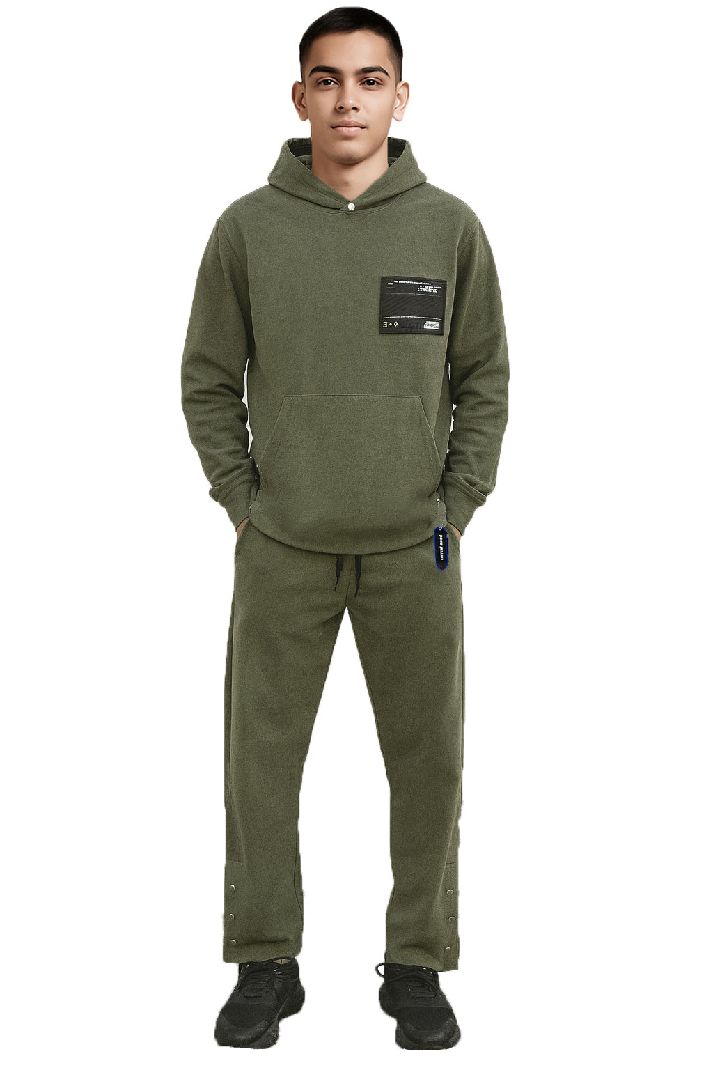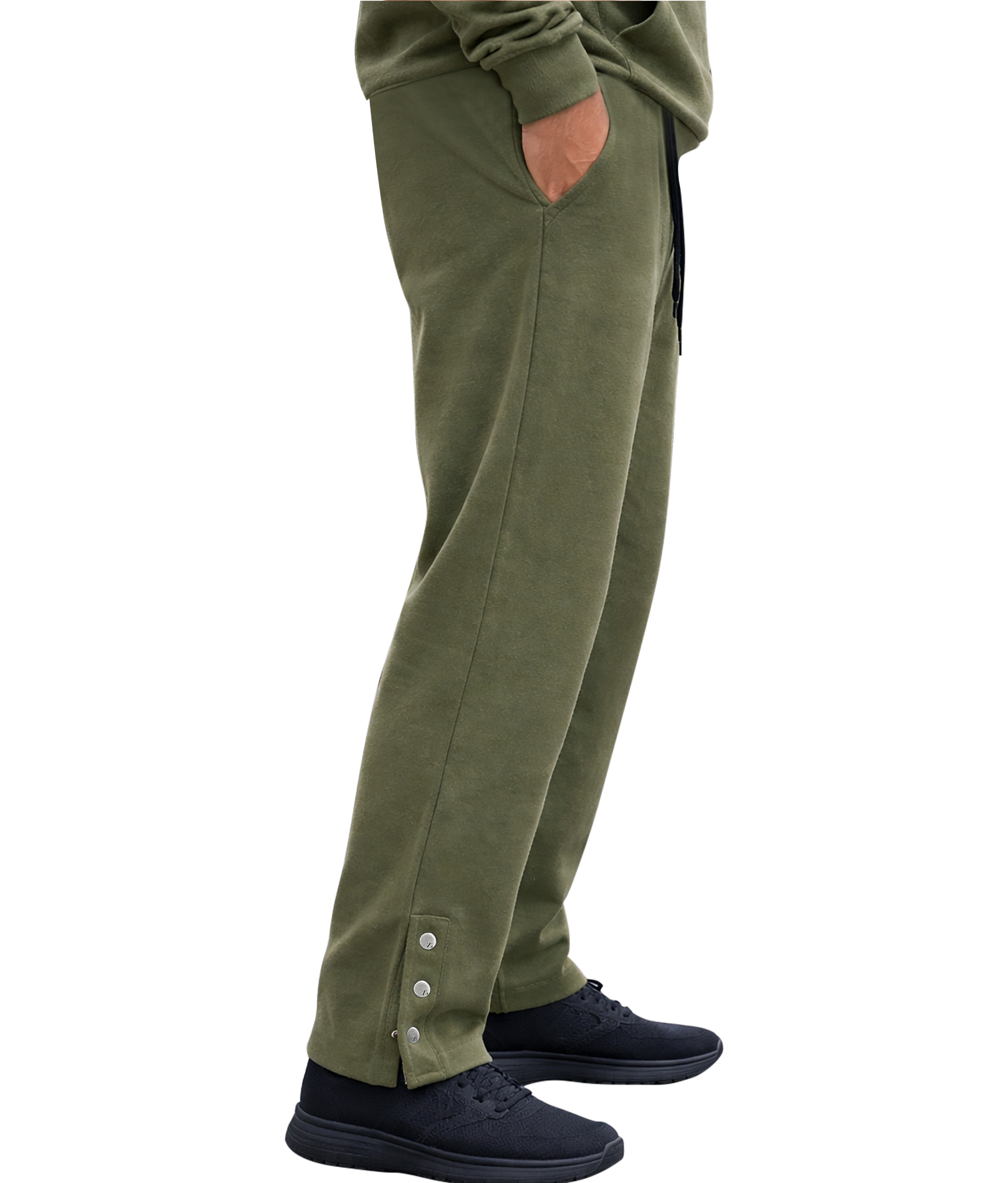 بنطال رياضي خفيف الوزن بلون الزيتوني، مزين بأزرار كبس عند الحافة، ورباط خصر قابل للتعديل، وقصة أنيقة ضيقة. مصمم لراحة عملية عصرية مع لمسة عصرية بسيطة.
