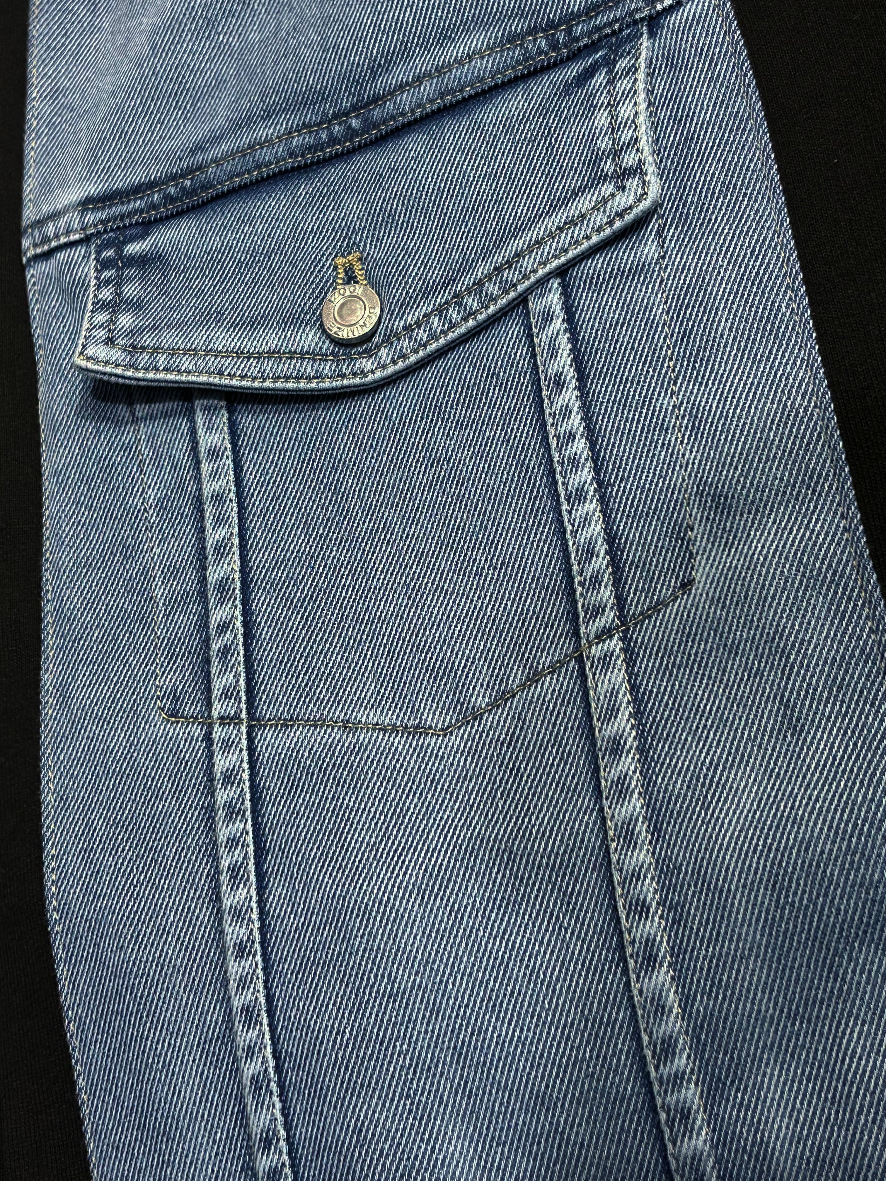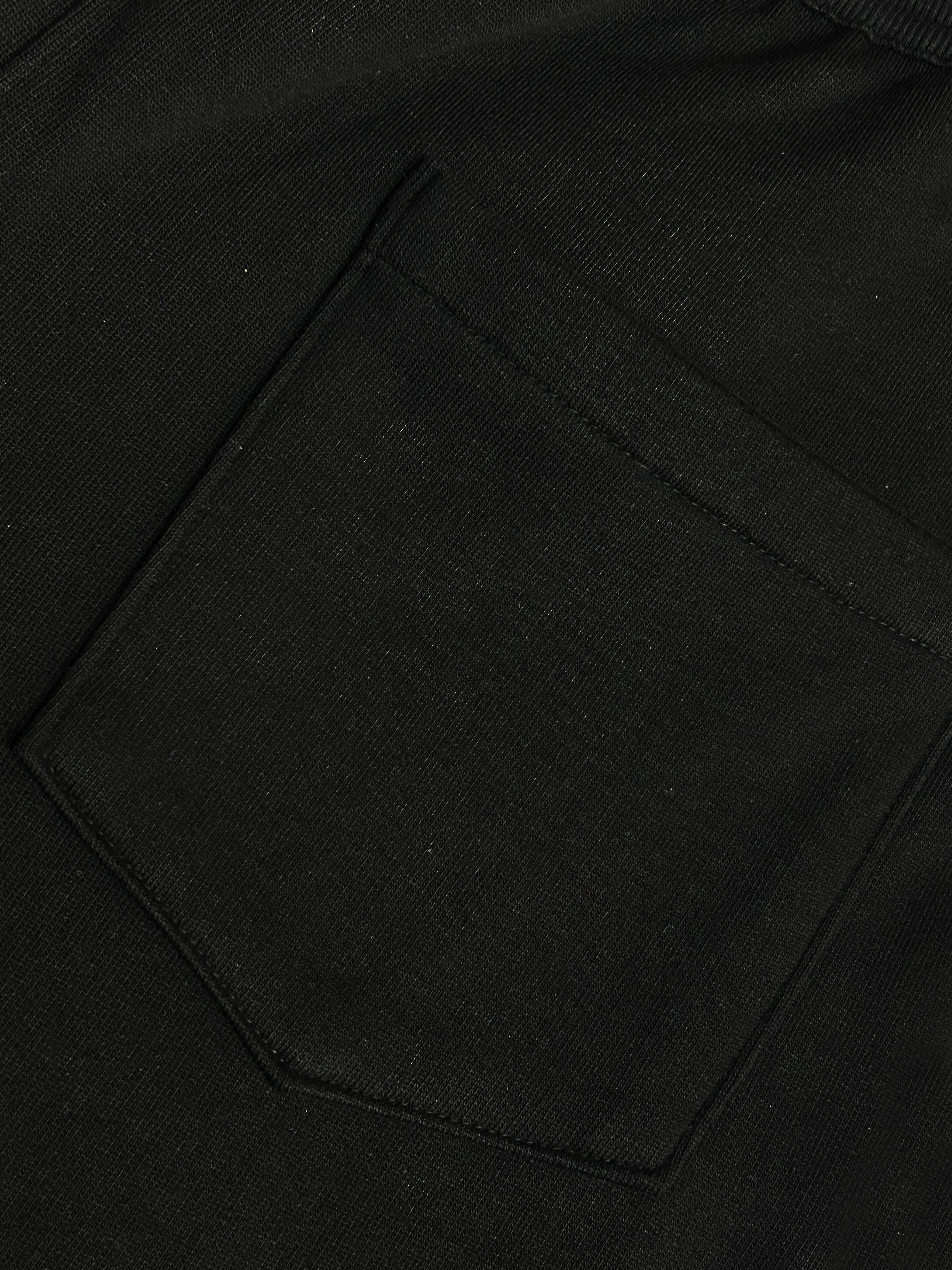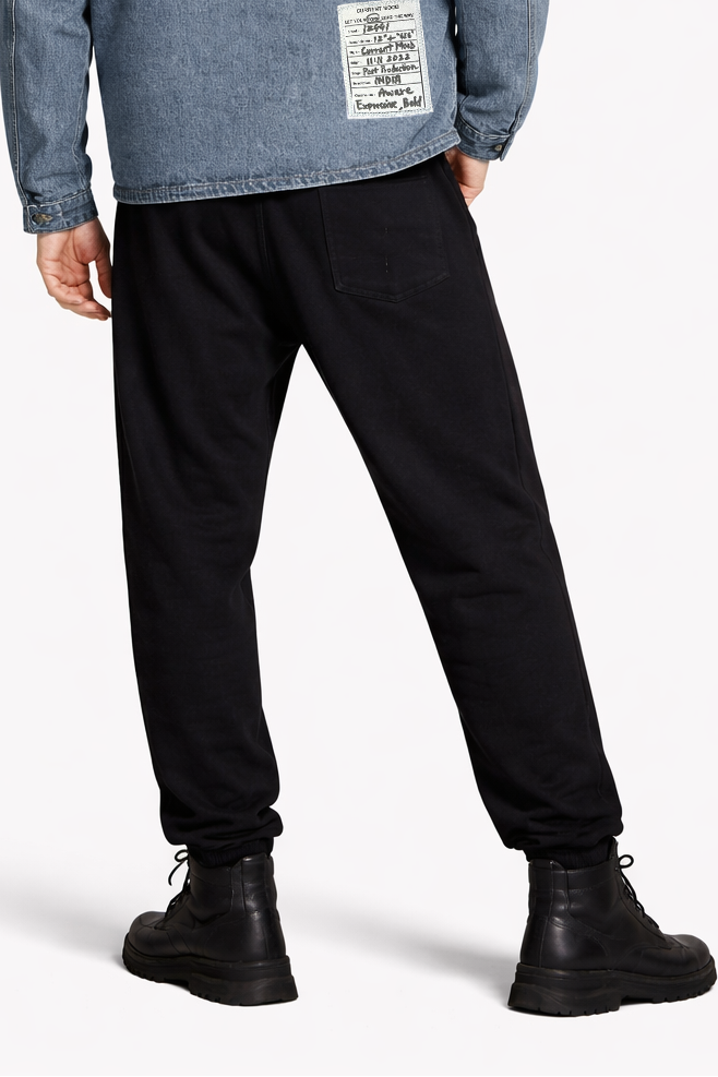 Black joggers featuring a bold blue denim patchwork panel with utility pocket detailing. Designed with elastic cuffs and a relaxed fit, blending comfort with an edgy, hybrid streetwear look.