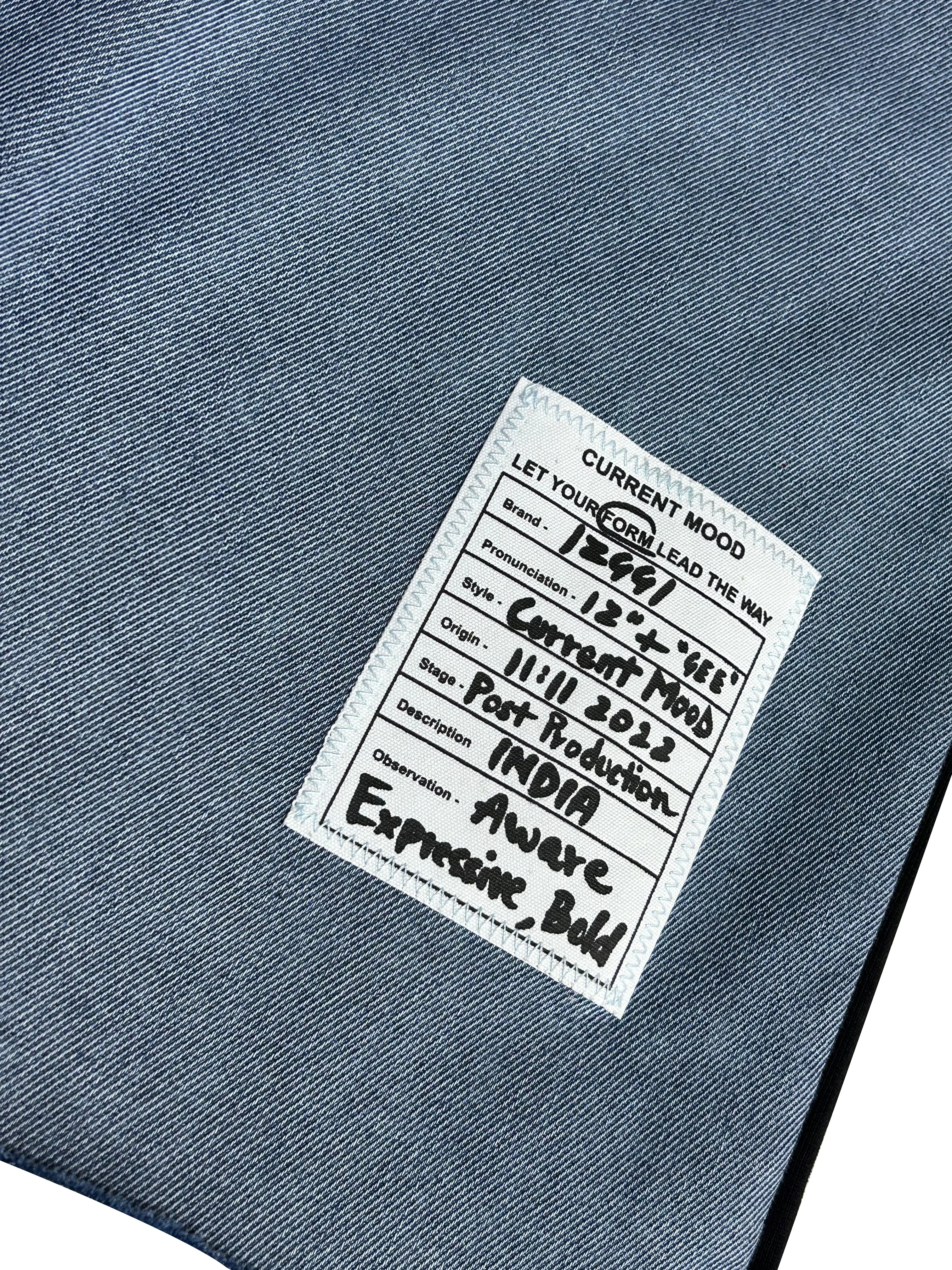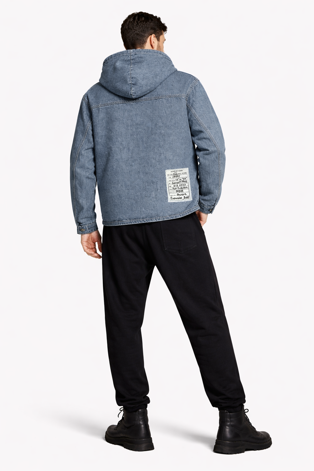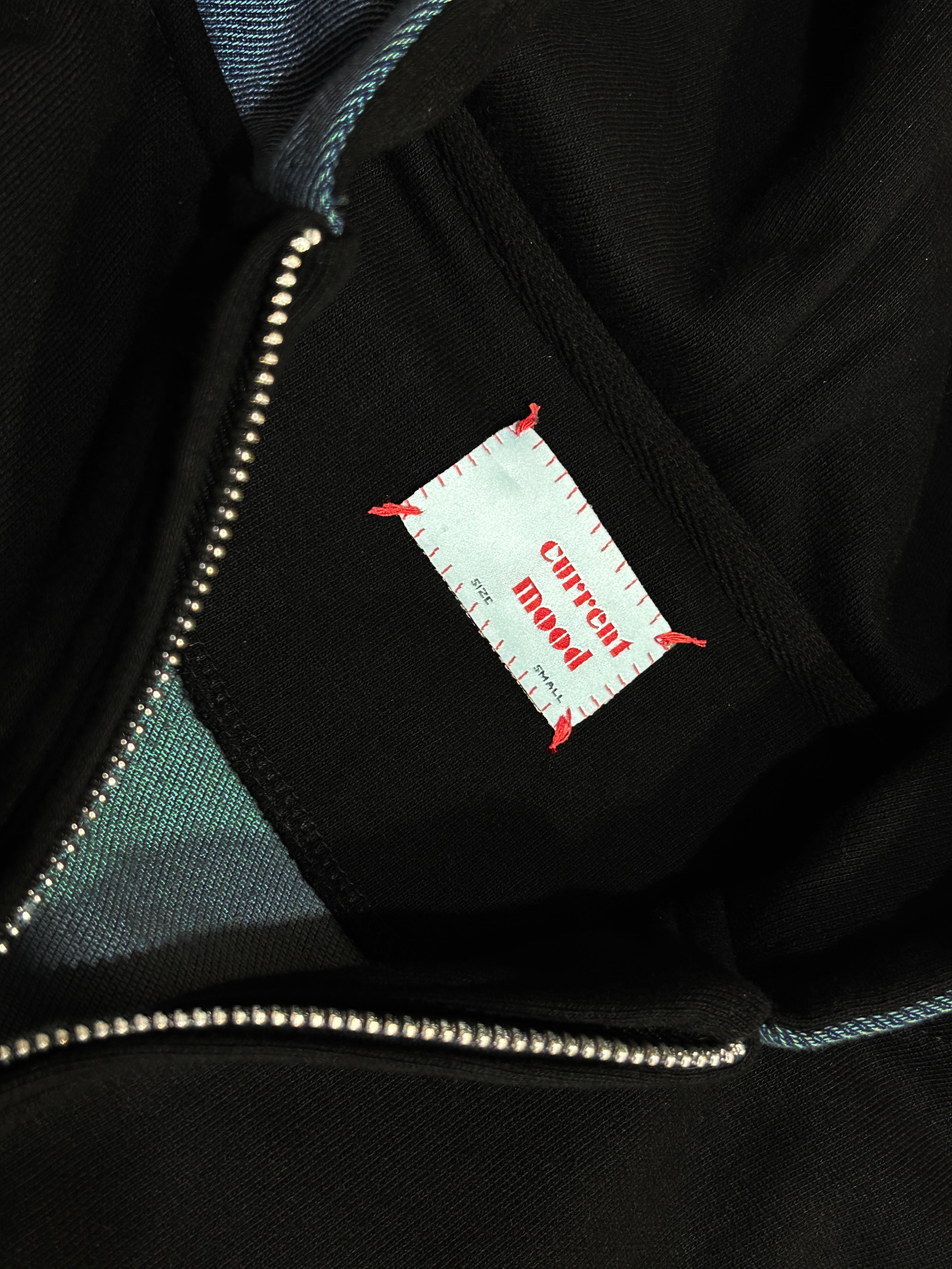 A modern layered zip hoodie featuring a black outer shell with raw-edge denim blue detailing on the hood, hem, and inner lining. Designed with sleek slit pockets, side openings, and a unique two-tone construction for an edgy, street-modern look.