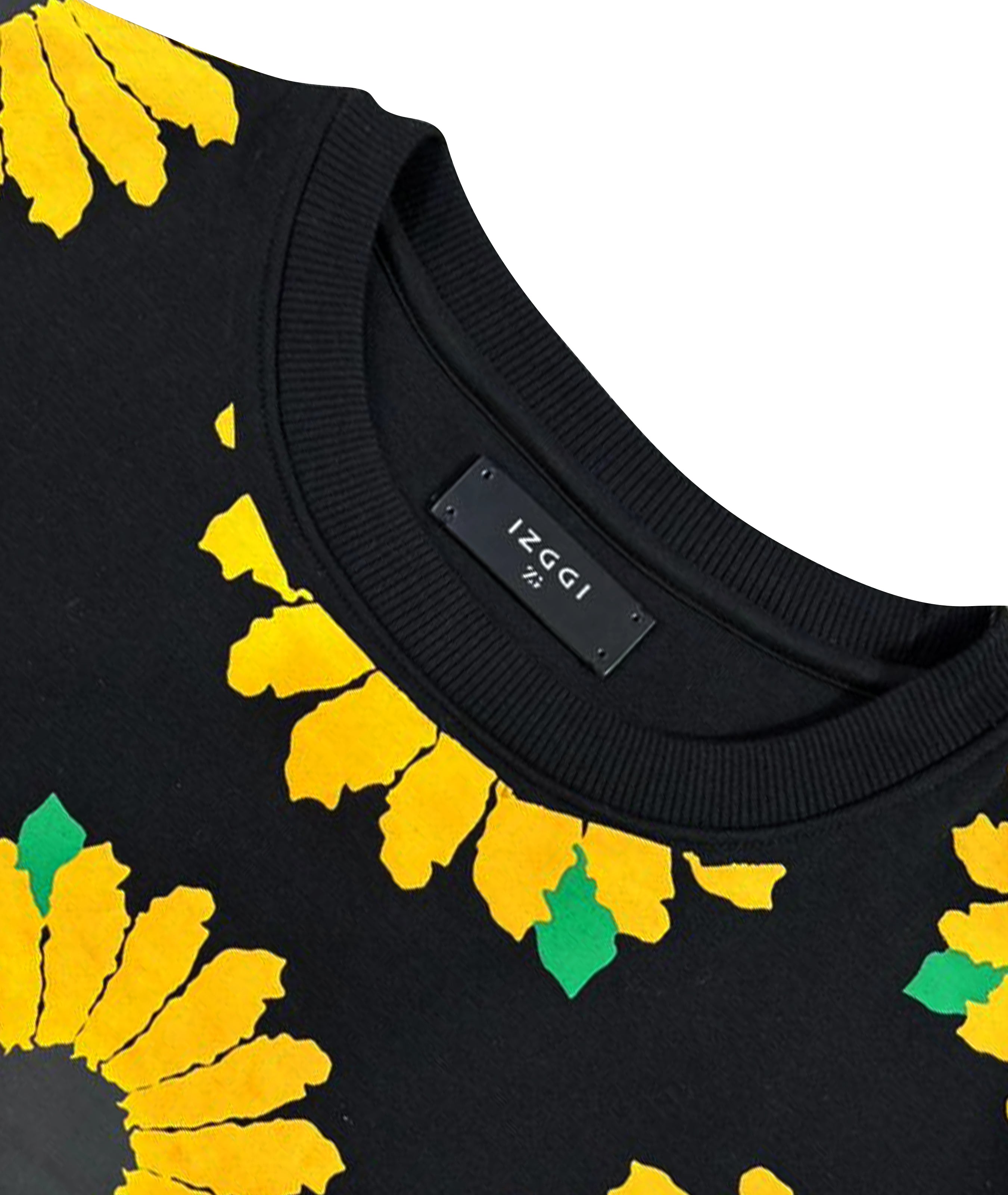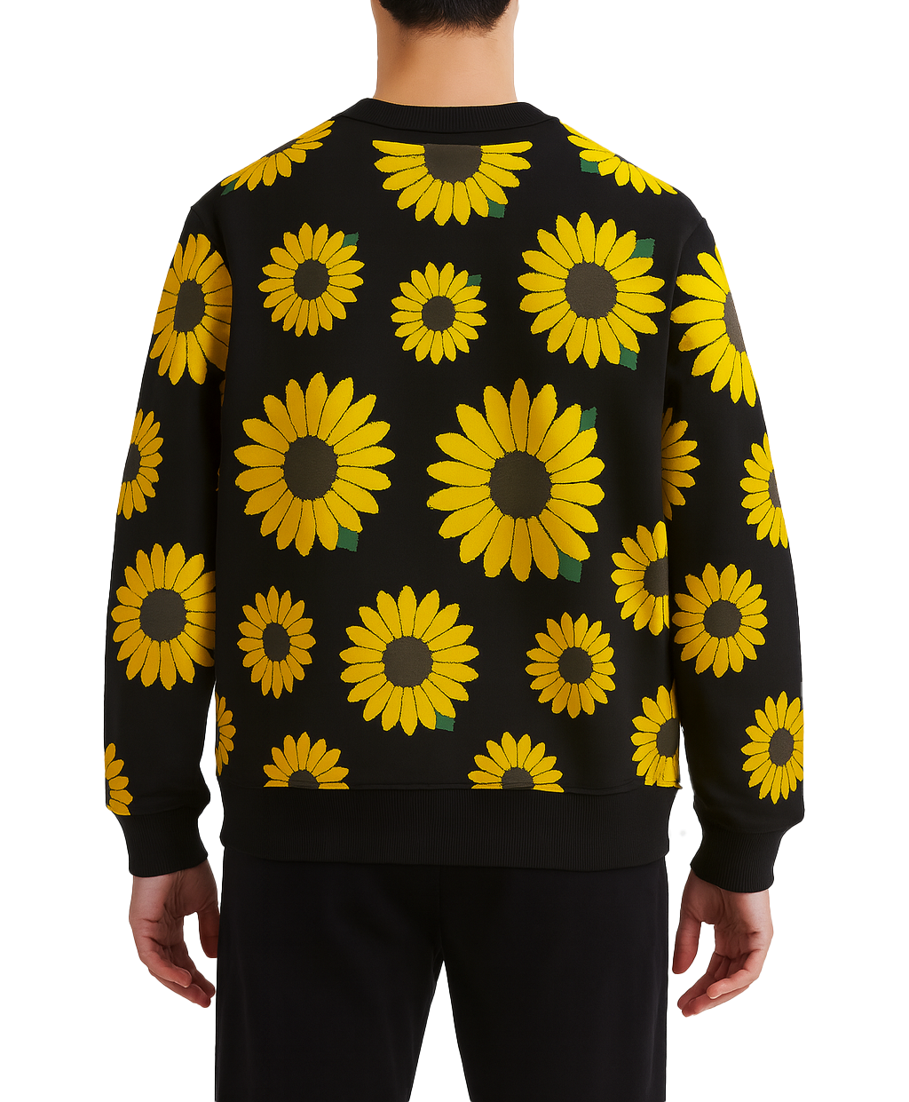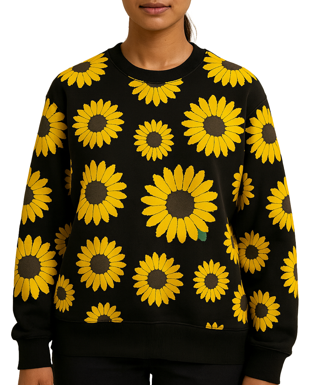 A vibrant black sweatshirt covered in bold sunflower blooms. Bright, cheerful, and crafted for effortless everyday style.