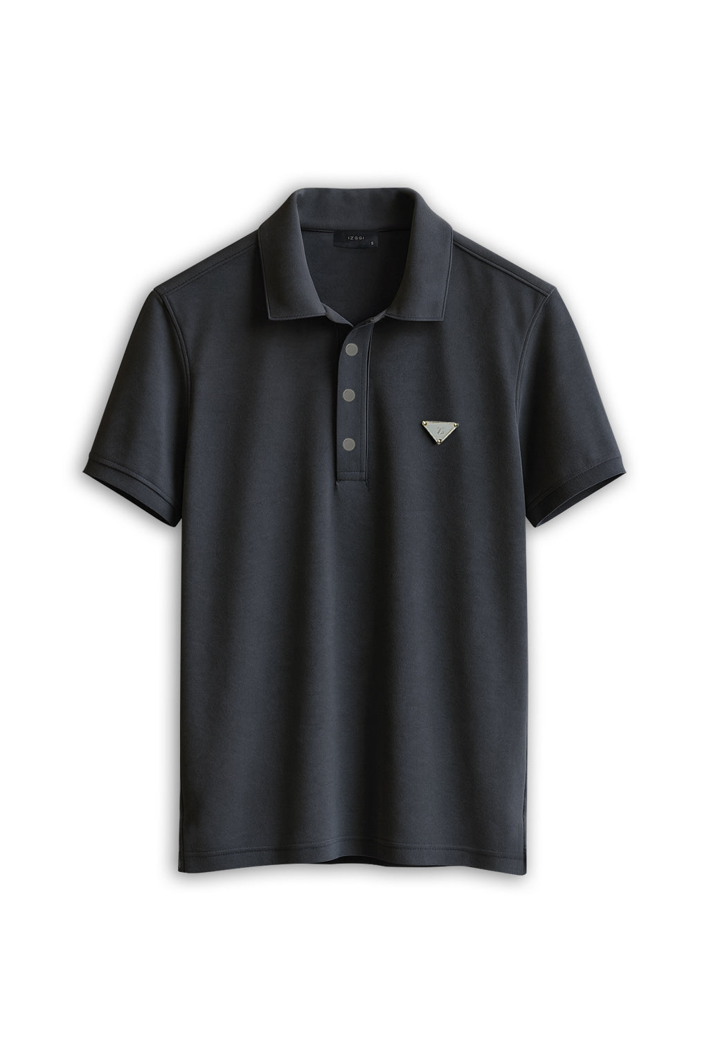 Crafted from smooth, mercerized cotton for a refined touch and durable wear. This grey polo features a classic regular fit with a placket detailed by snap buttons for easy styling. Finished with a subtle metal logo plate on the left chest, it offers understated branding. Designed to wear solo or as part of the co-ord.
