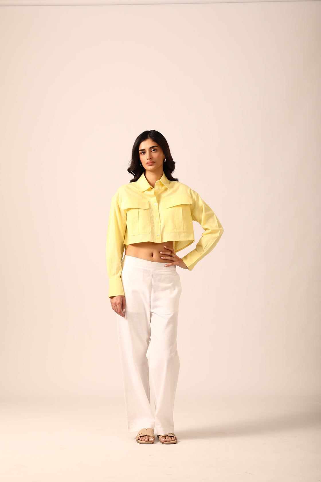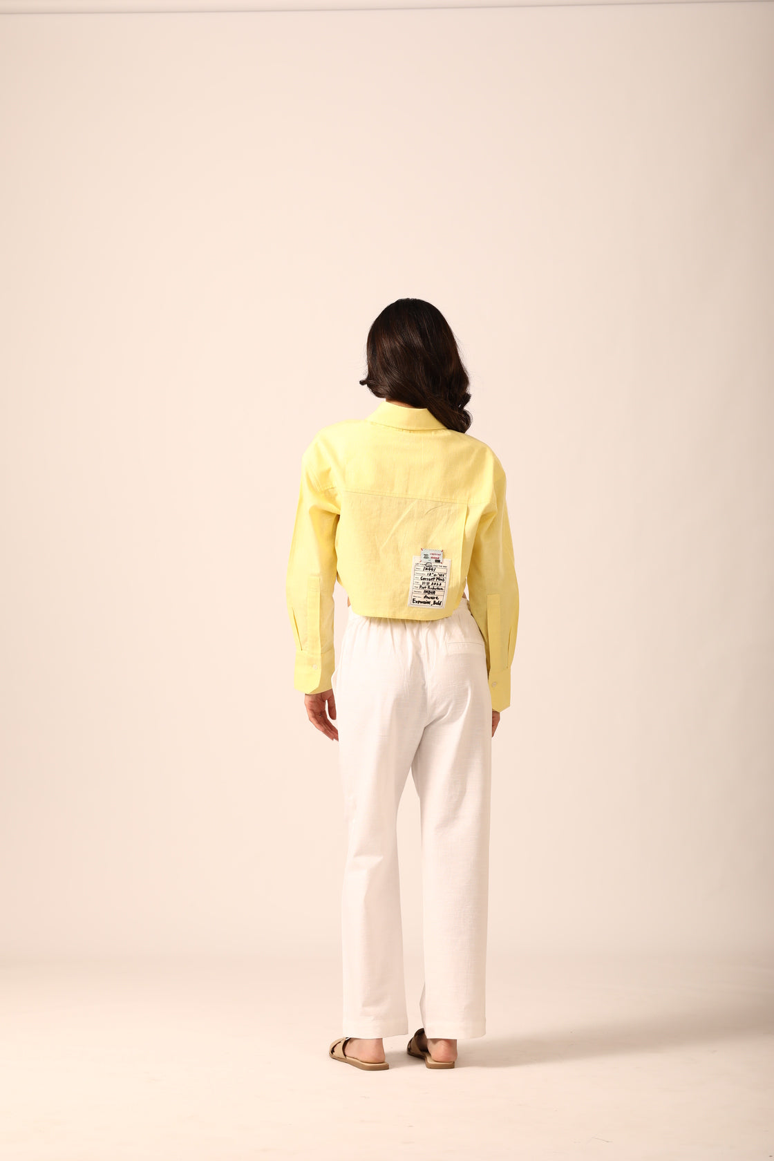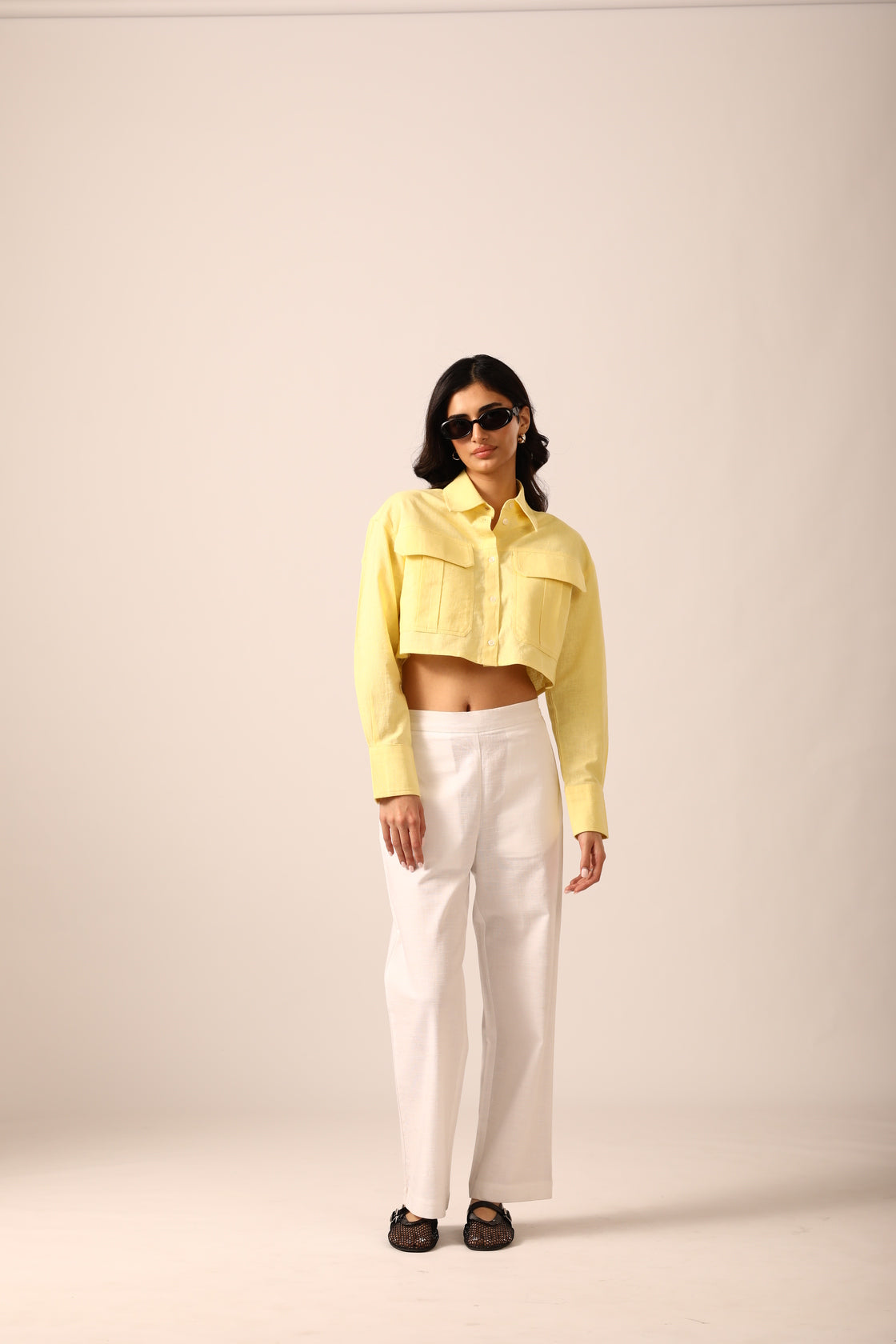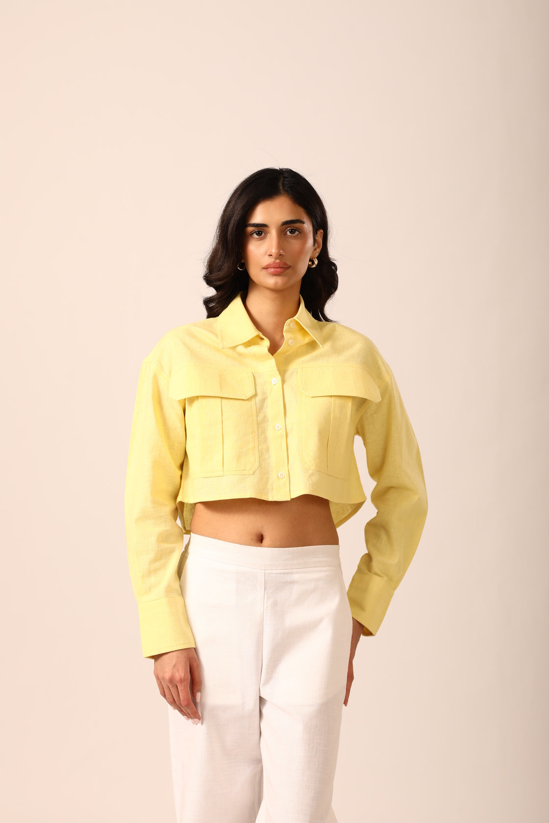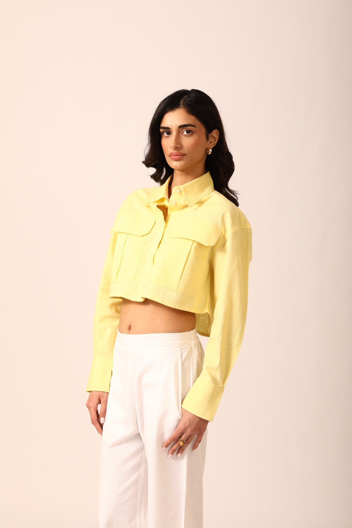Structured cropped shirt crafted from a breathable linen-blend fabric, designed with 3D flap pockets, a classic shirt collar, and a box pleat at the back for added shape. Finished with a subtle brand patch at the lower back left corner.