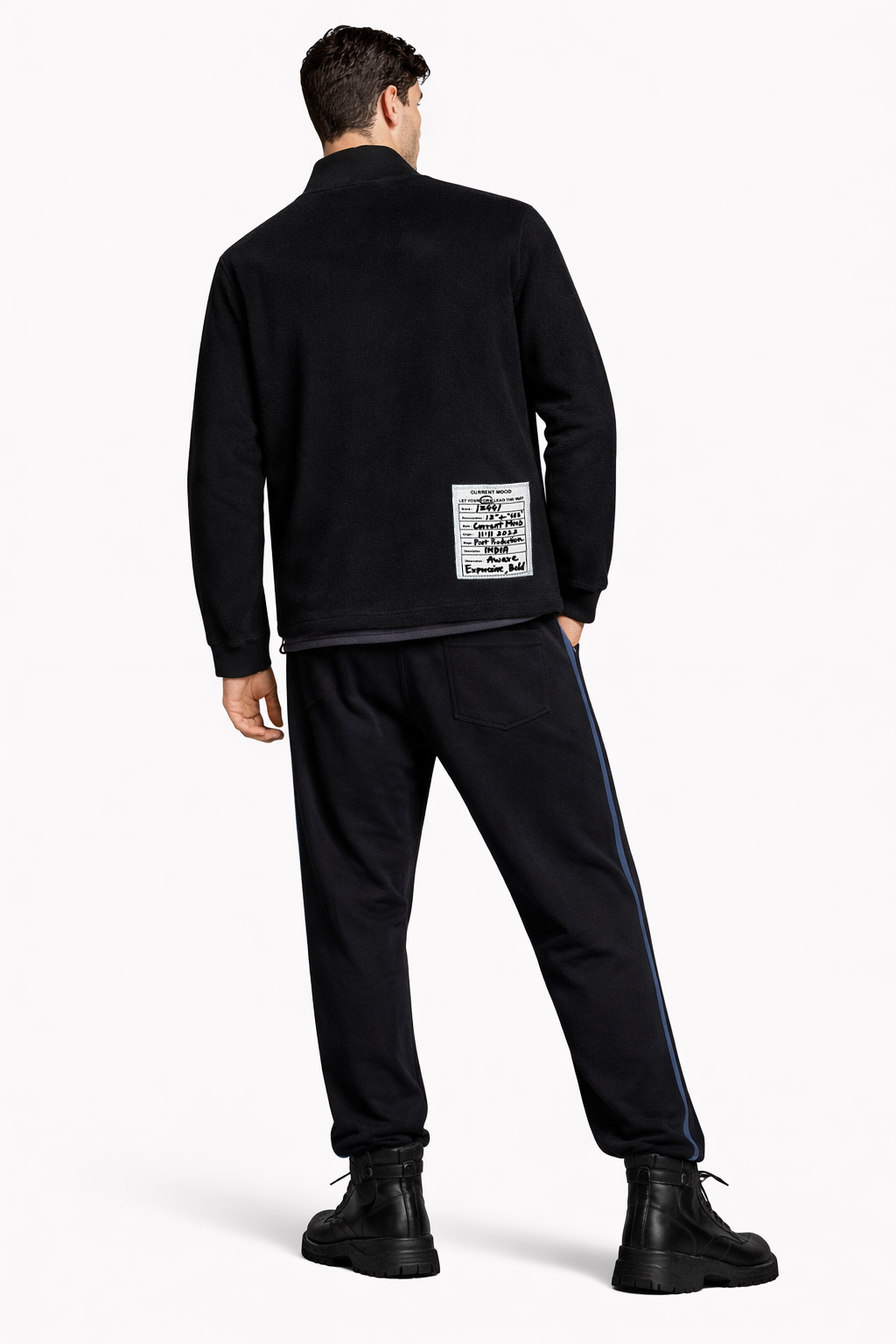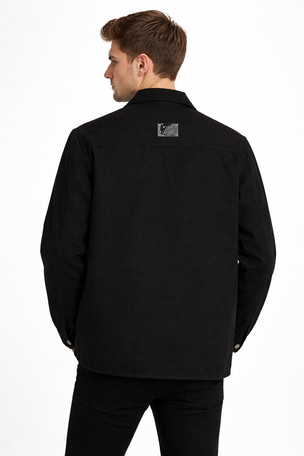 A sleek black utility jacket featuring clean panel detailing, multiple stitched pockets, and a structured collar for a modern workwear-inspired look.
