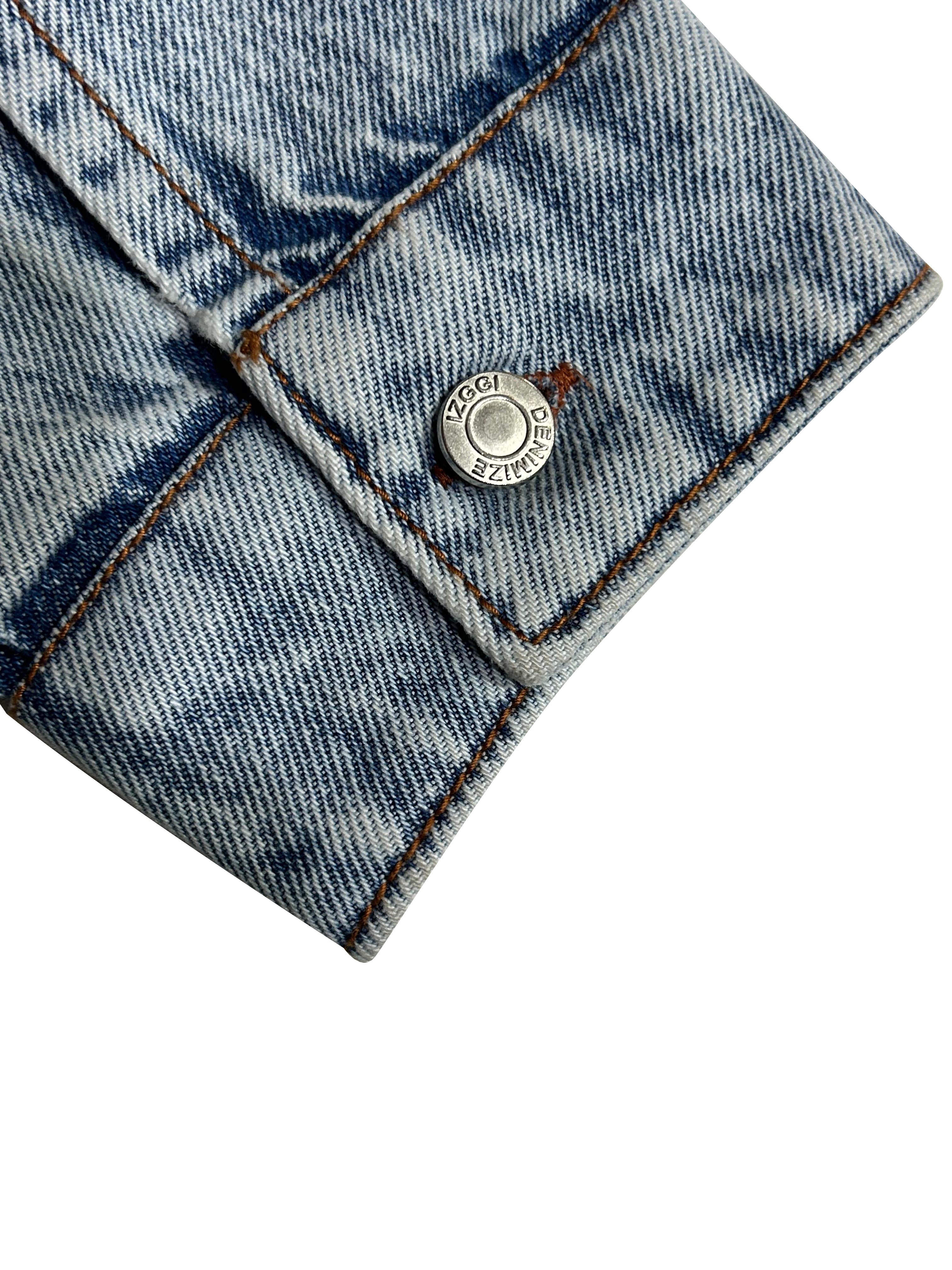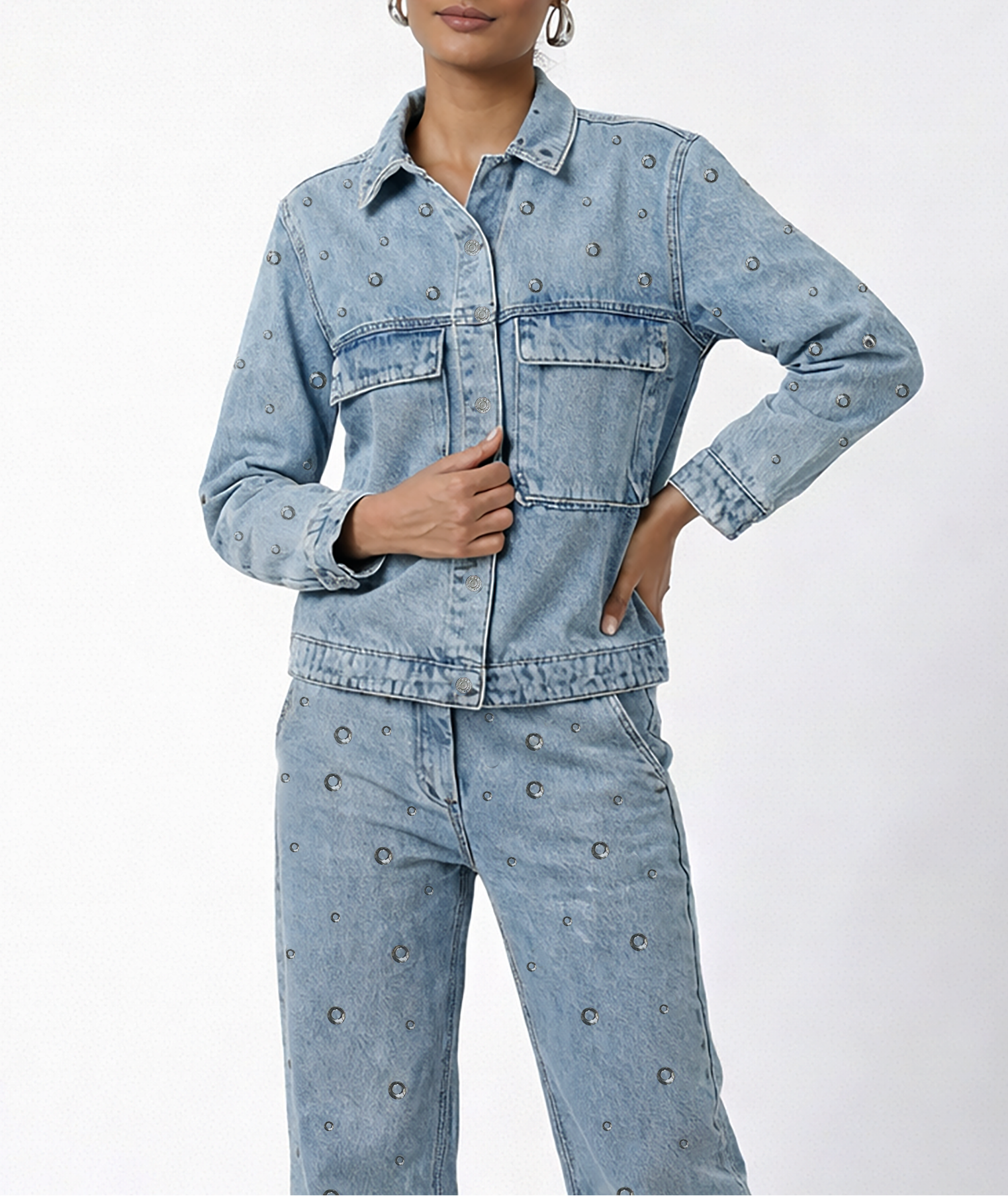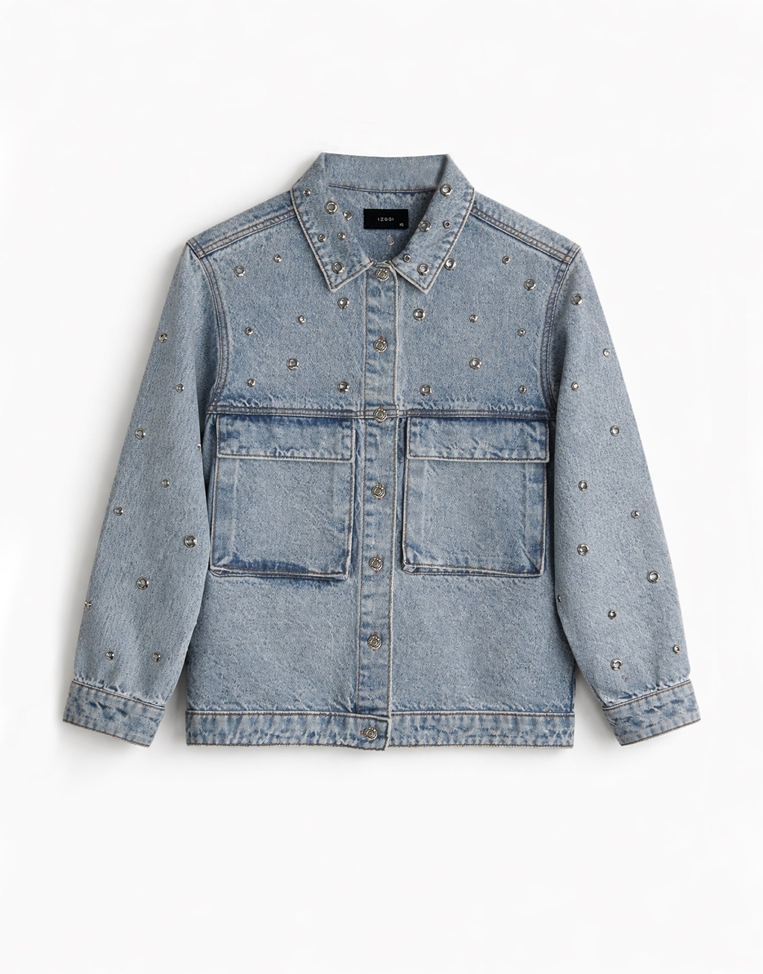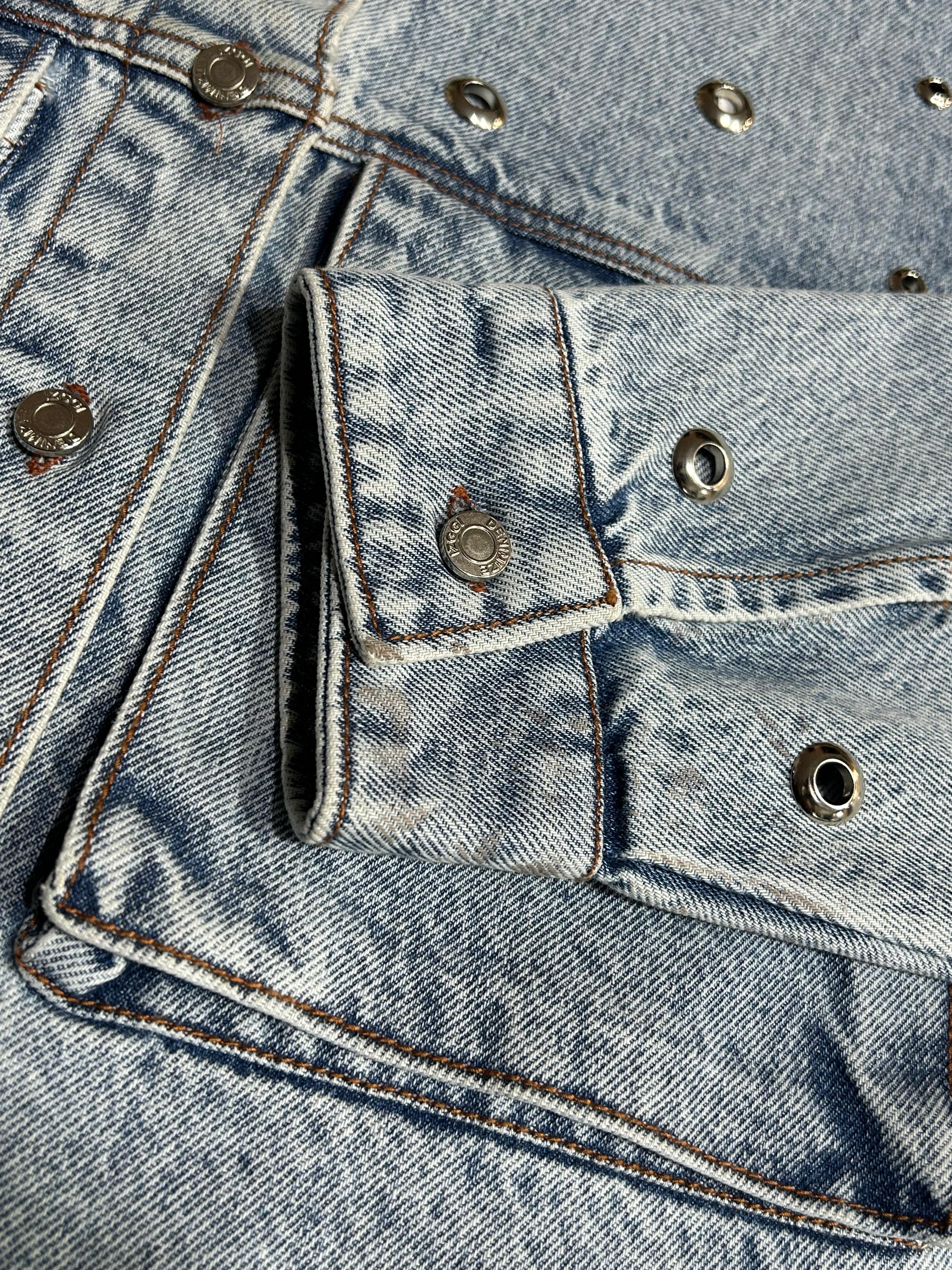 Statement denim jacket with metal rivet detailing and a rugged washed finish, built for a bold street-utility look.