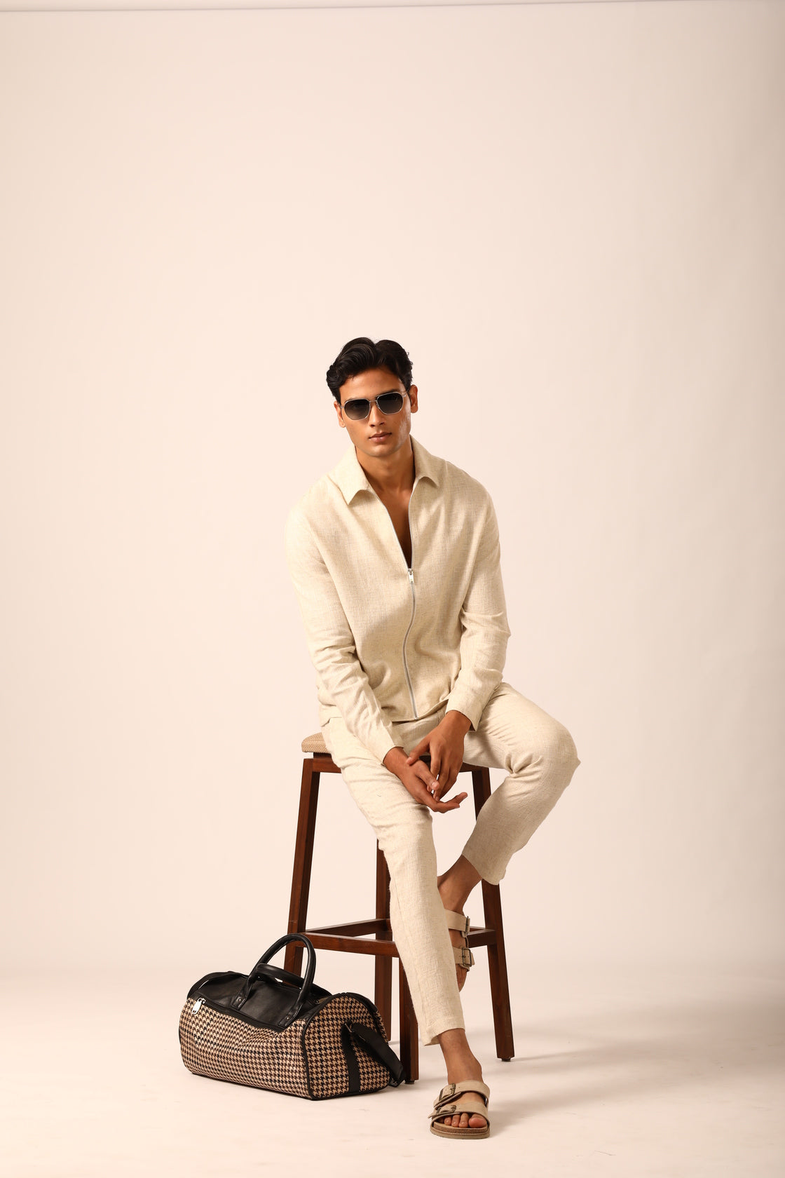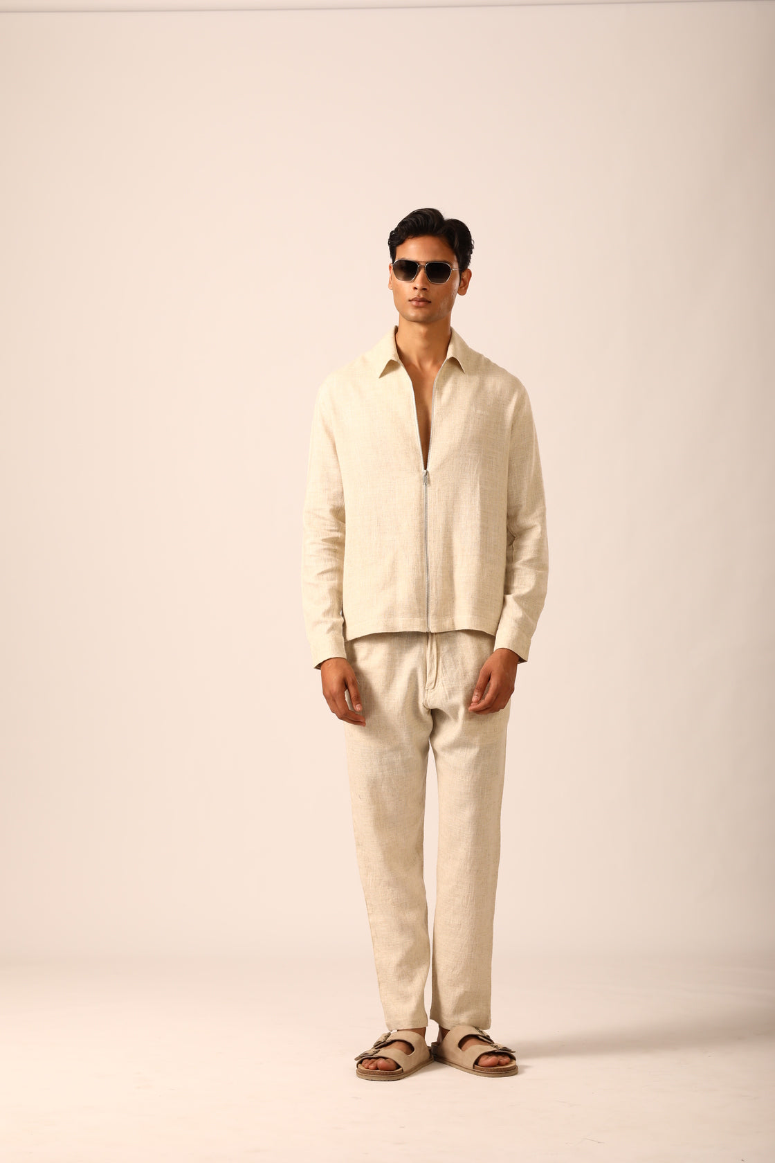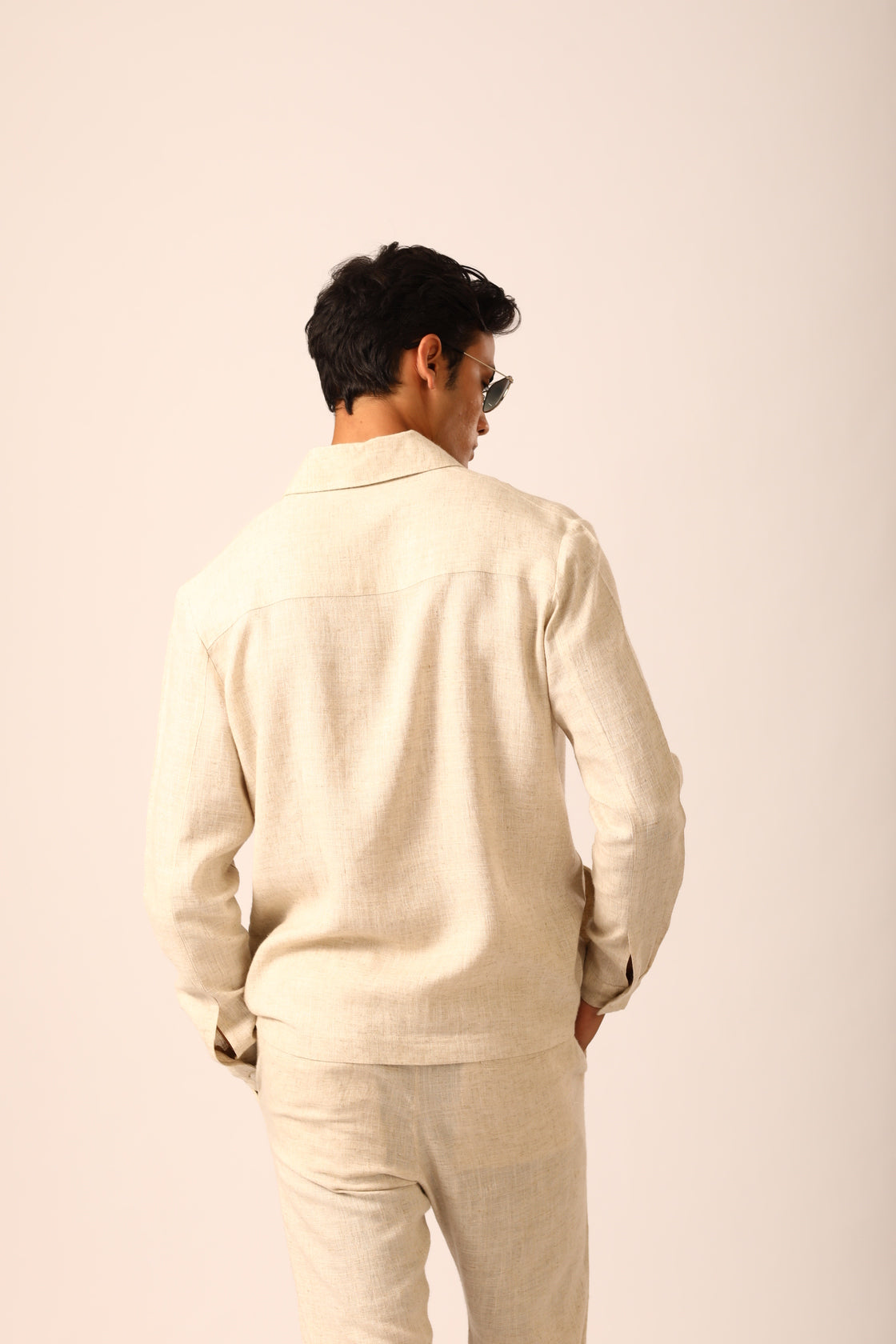 Overshirt crafted from a linen-blend fabric, featuring a lapel collar, long sleeves, and a zip-up front for a contemporary finish. Subtly detailed with brand name embroidery on the upper left side, adding a refined signature touch to the clean, structured garment
